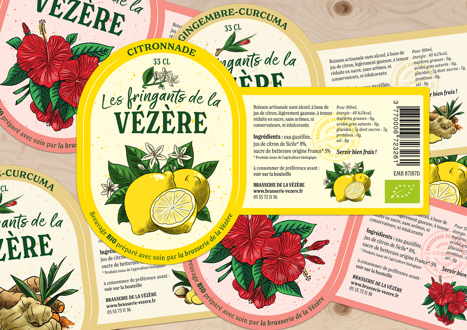"Les fringants de la Vézère" sont des boissons artisanales bio sans alcool, délicatement pétillantes, peu sucrées, sans additifs ni conservateurs. Création du naming, de l’identité et de l’habillage de la gamme de softs "Les fringants de la Vézère" pour la brasserie de la Vézère établie à Uzerche.