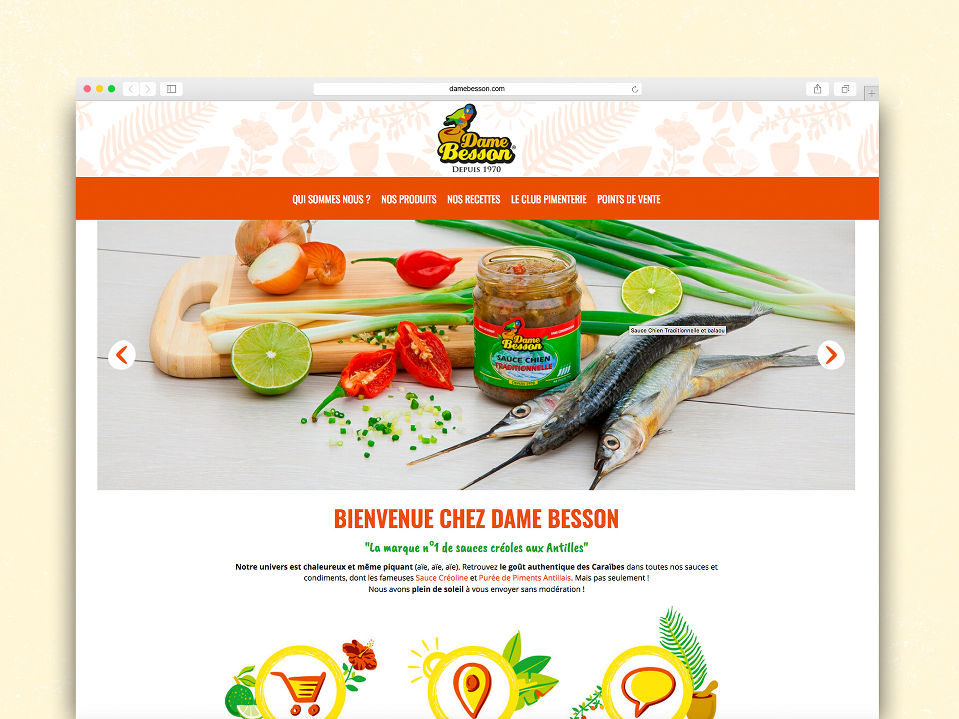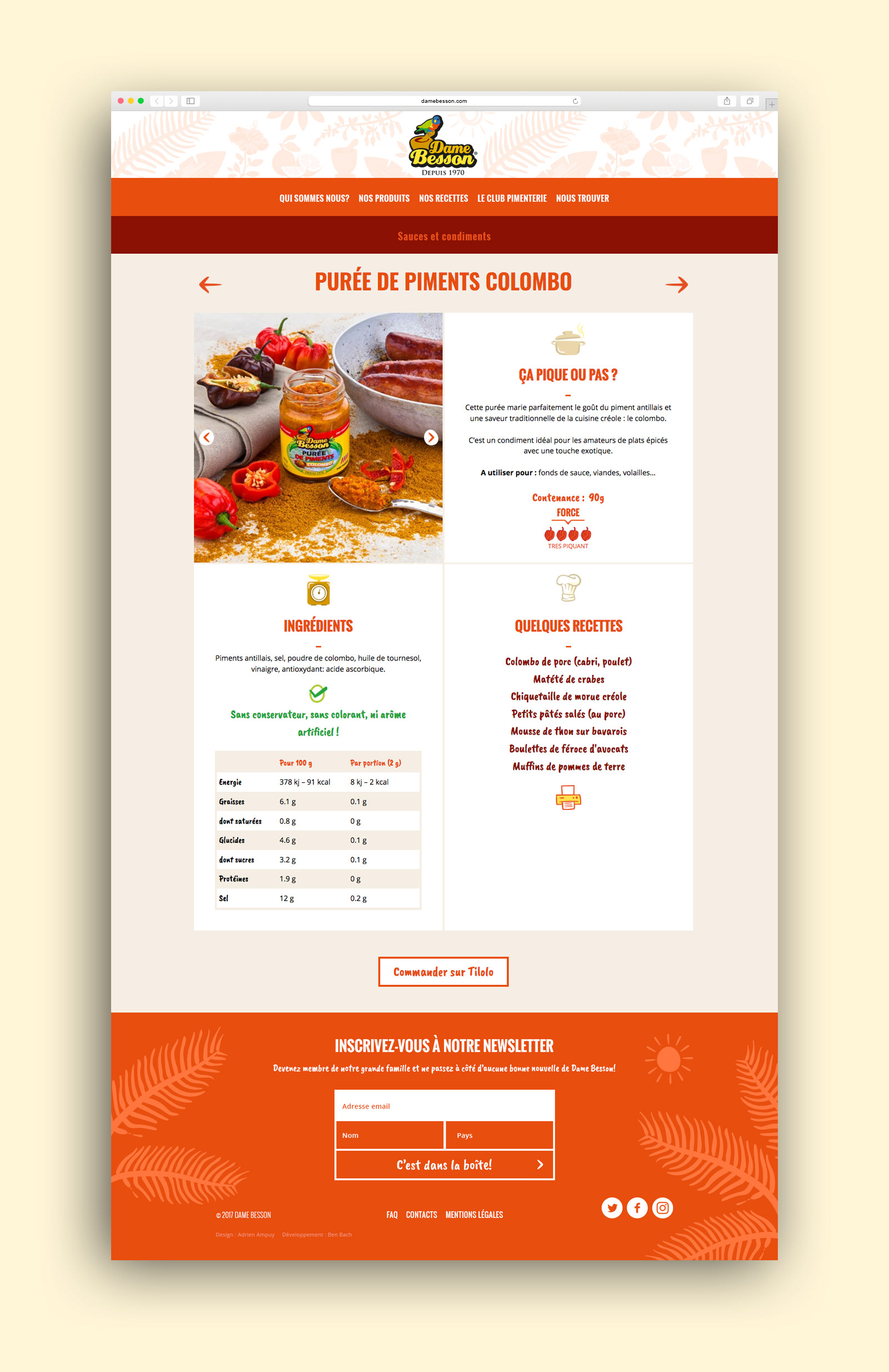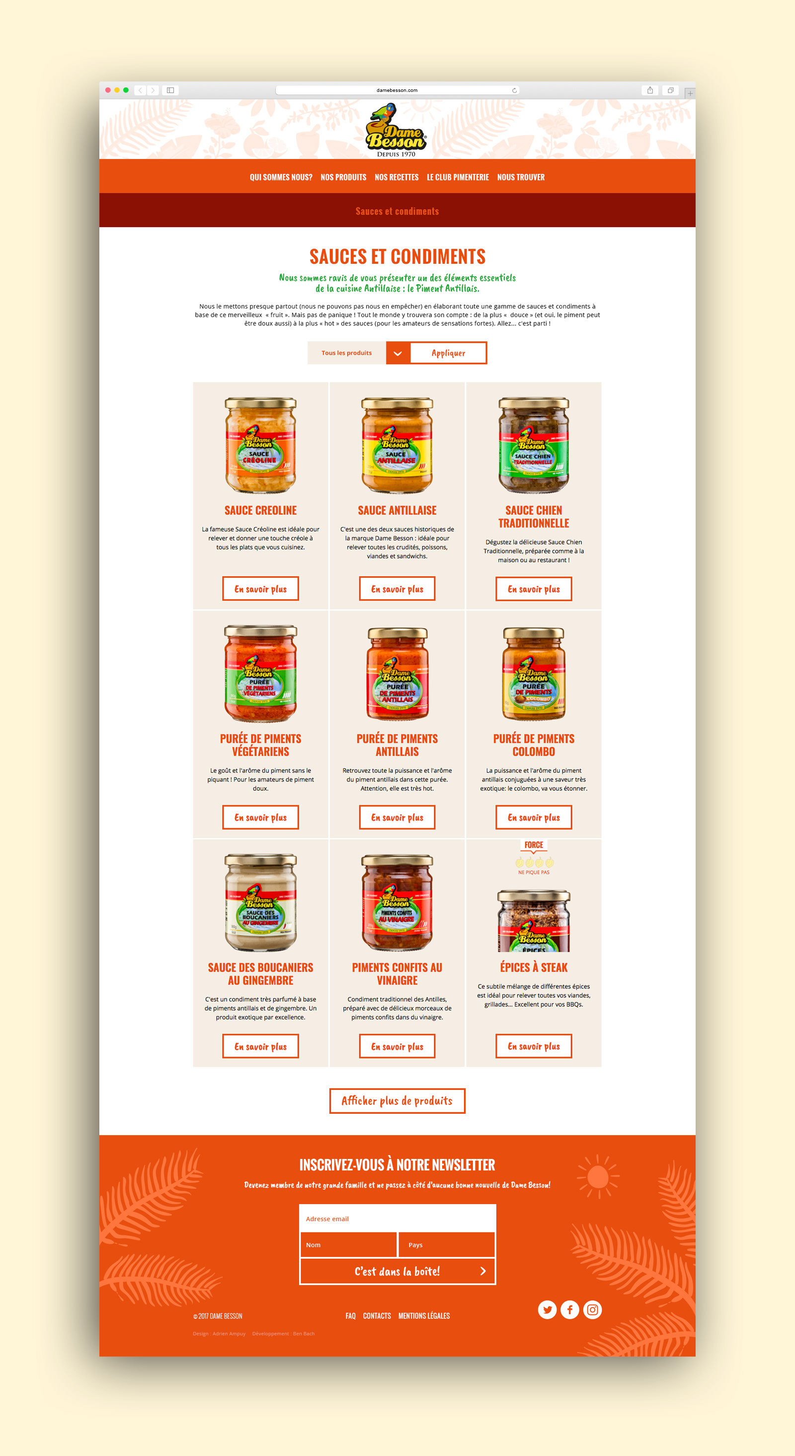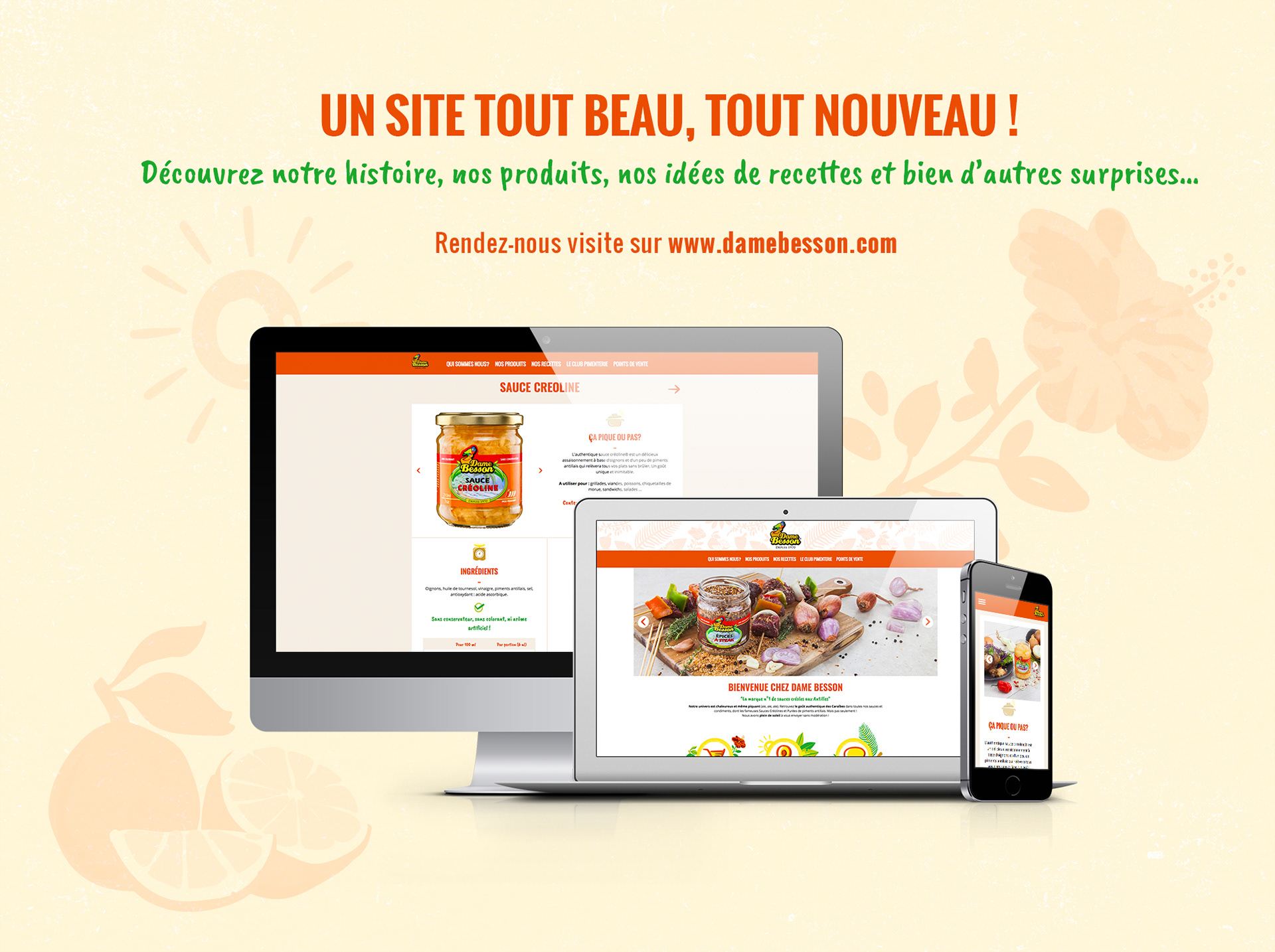 Dame Besson est la marque n°1 de sauces créoles aux Antilles. Une entreprise familiale qui met à l'honneur les produits du terroir et propose une gamme de mets savoureux et authentiques. J'ai le plaisir de travailler avec Dame Besson depuis plus d'un an. J'ai ainsi réalisé l'ergonomie et le design de leur nouveau site internet ainsi qu'une série de visuels promotionnels.