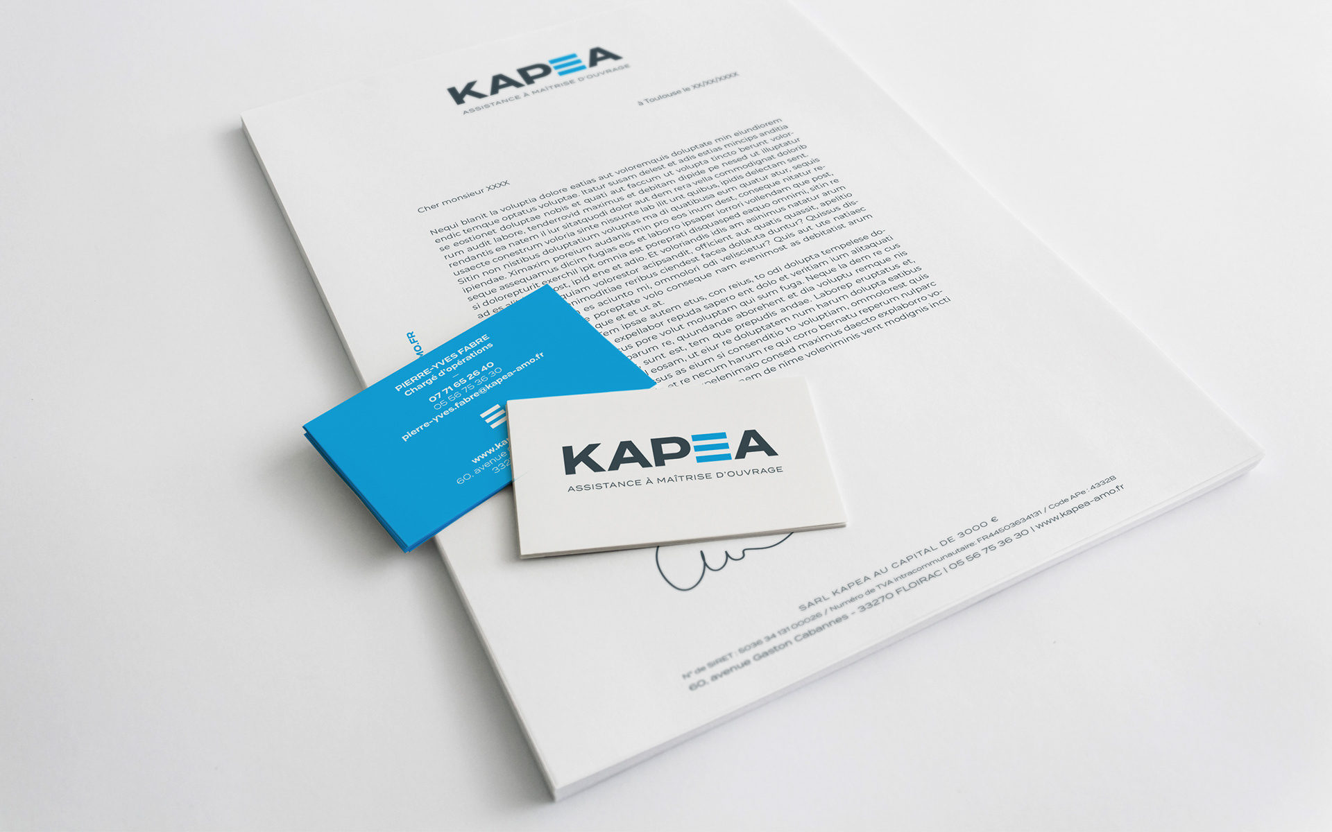 KAPEA est une société d’assistance à maîtrise d’ouvrage accompagnant les investisseurs publics et privés dans leur projets. Réalisation de l'identité visuelle de l'entreprise, déclinaison sur papeterie et différents supports technique.