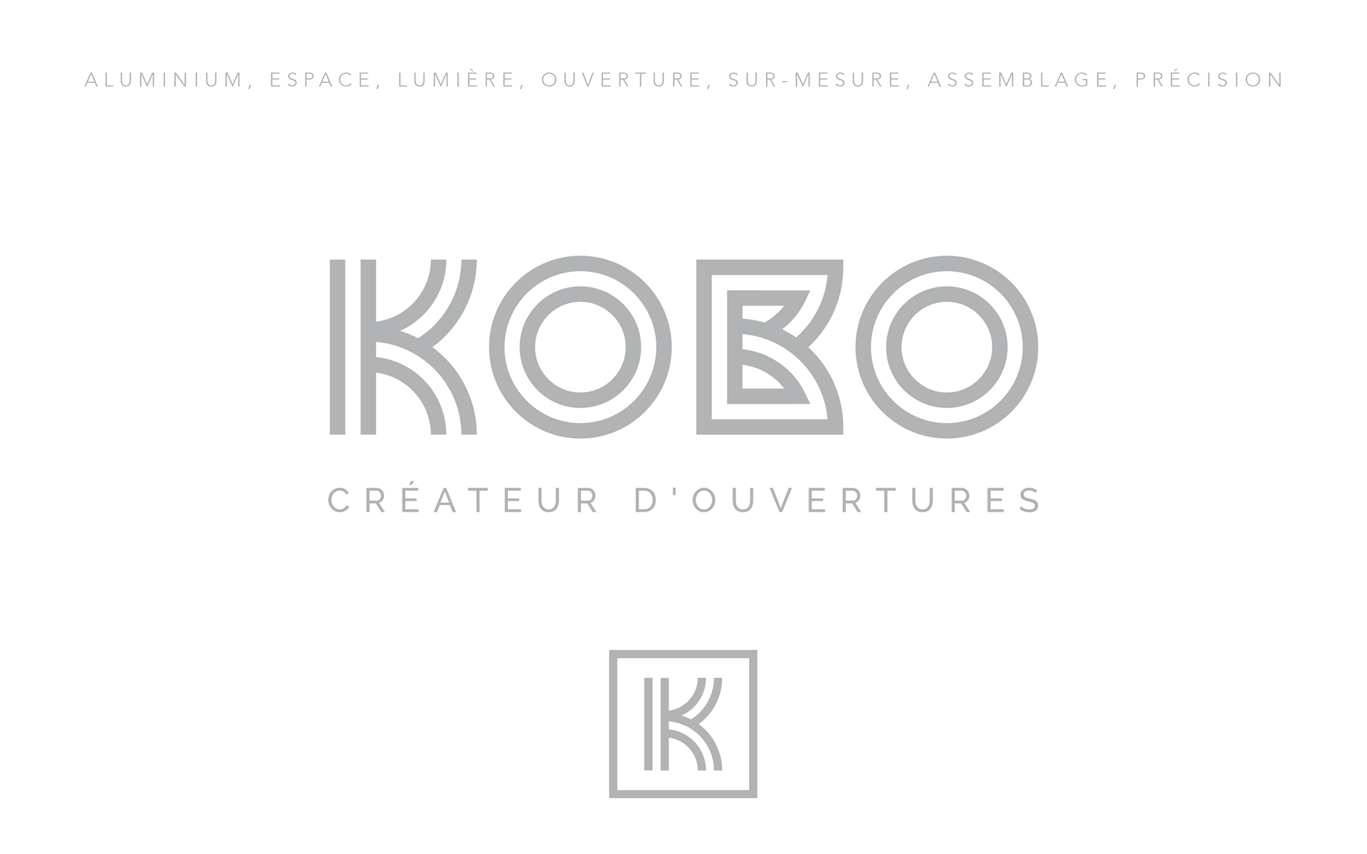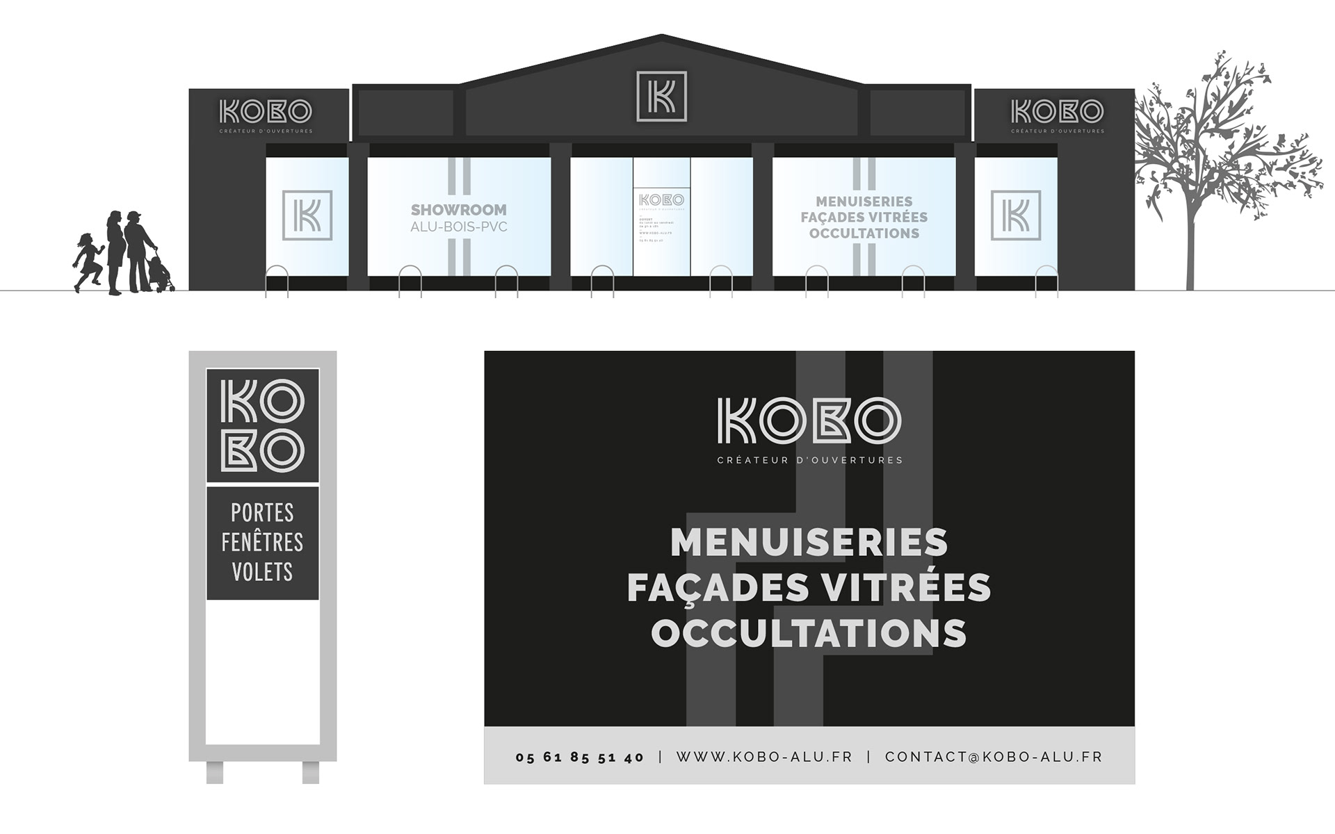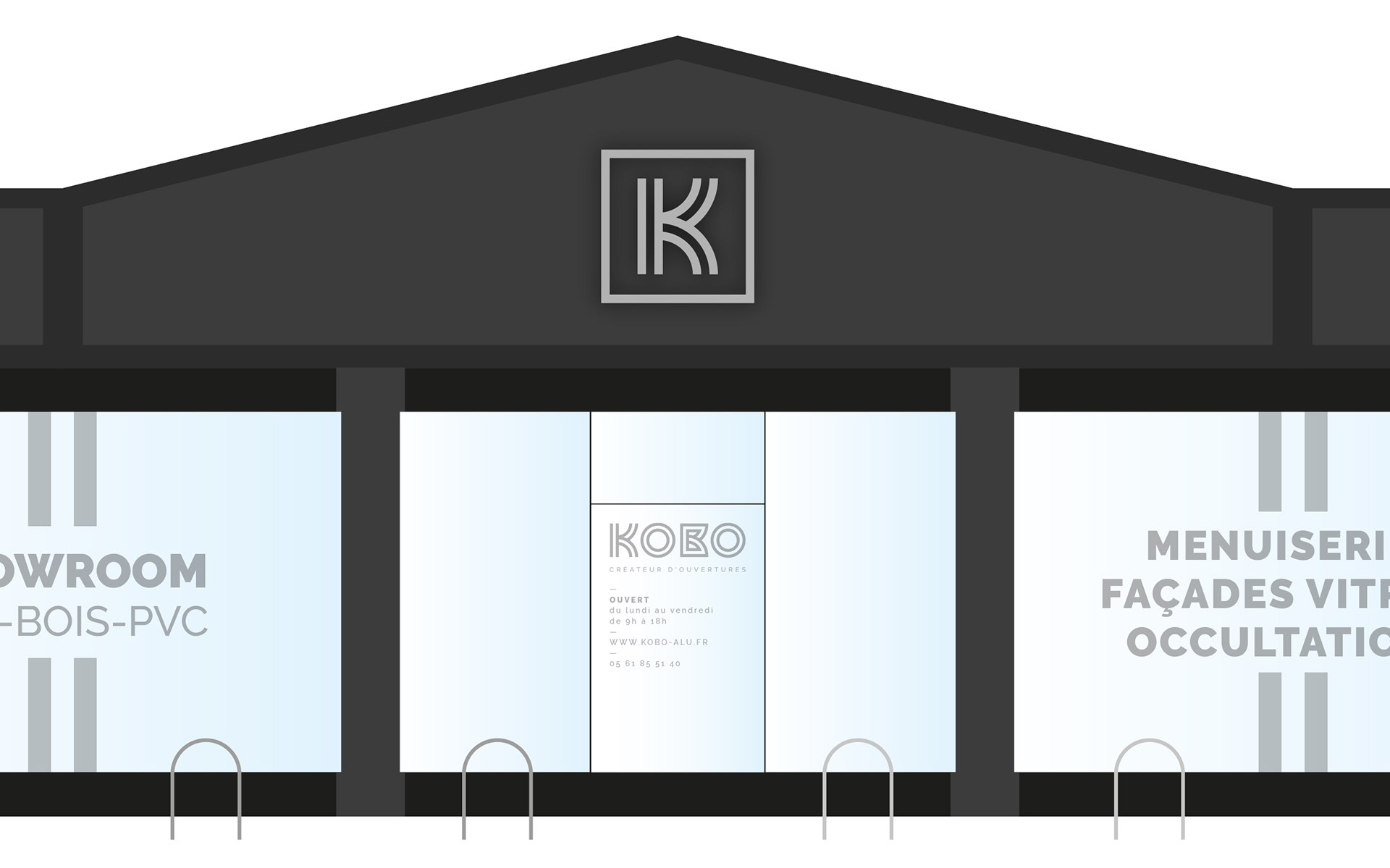 Kobo intervient pour tous vos projets de menuiseries aluminium, PVC et bois. Réalisation de l'identité visuelle de l'entreprise, déclinaison sur papeterie et différents supports technique. Habillage façade de la boutique.