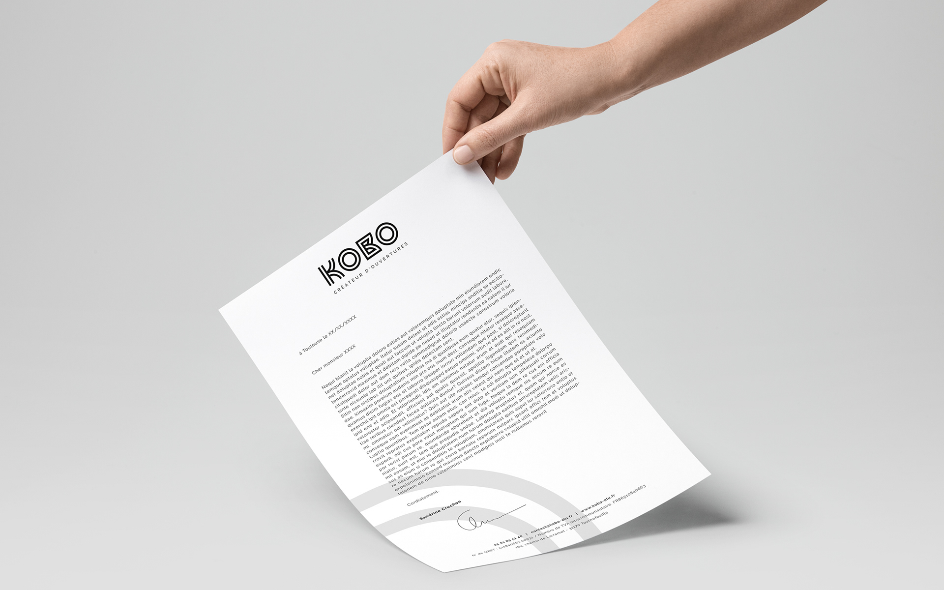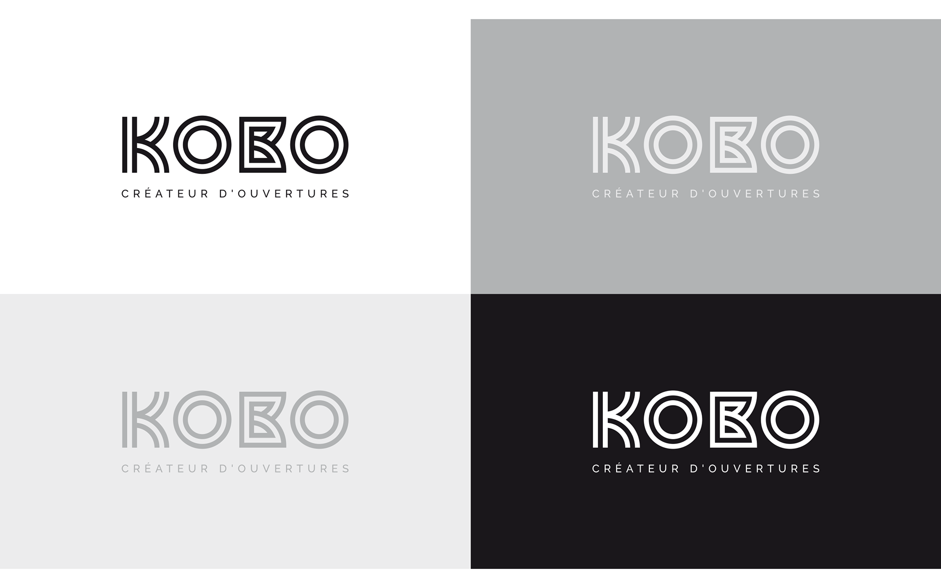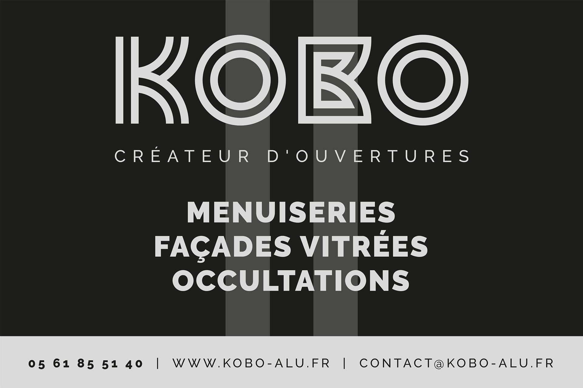 Kobo intervient pour tous vos projets de menuiseries aluminium, PVC et bois. Réalisation de l'identité visuelle de l'entreprise, déclinaison sur papeterie et différents supports technique. Habillage façade de la boutique.