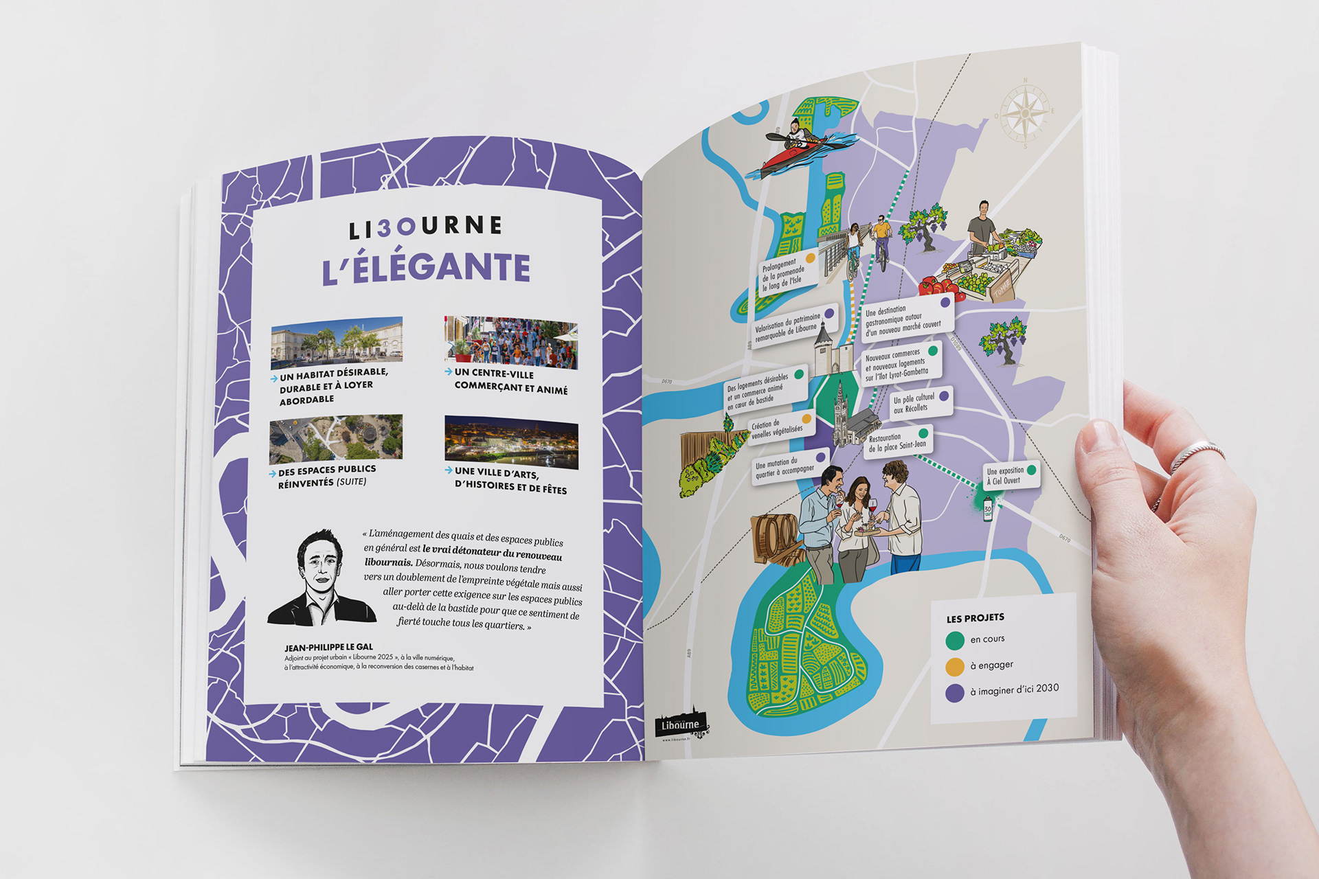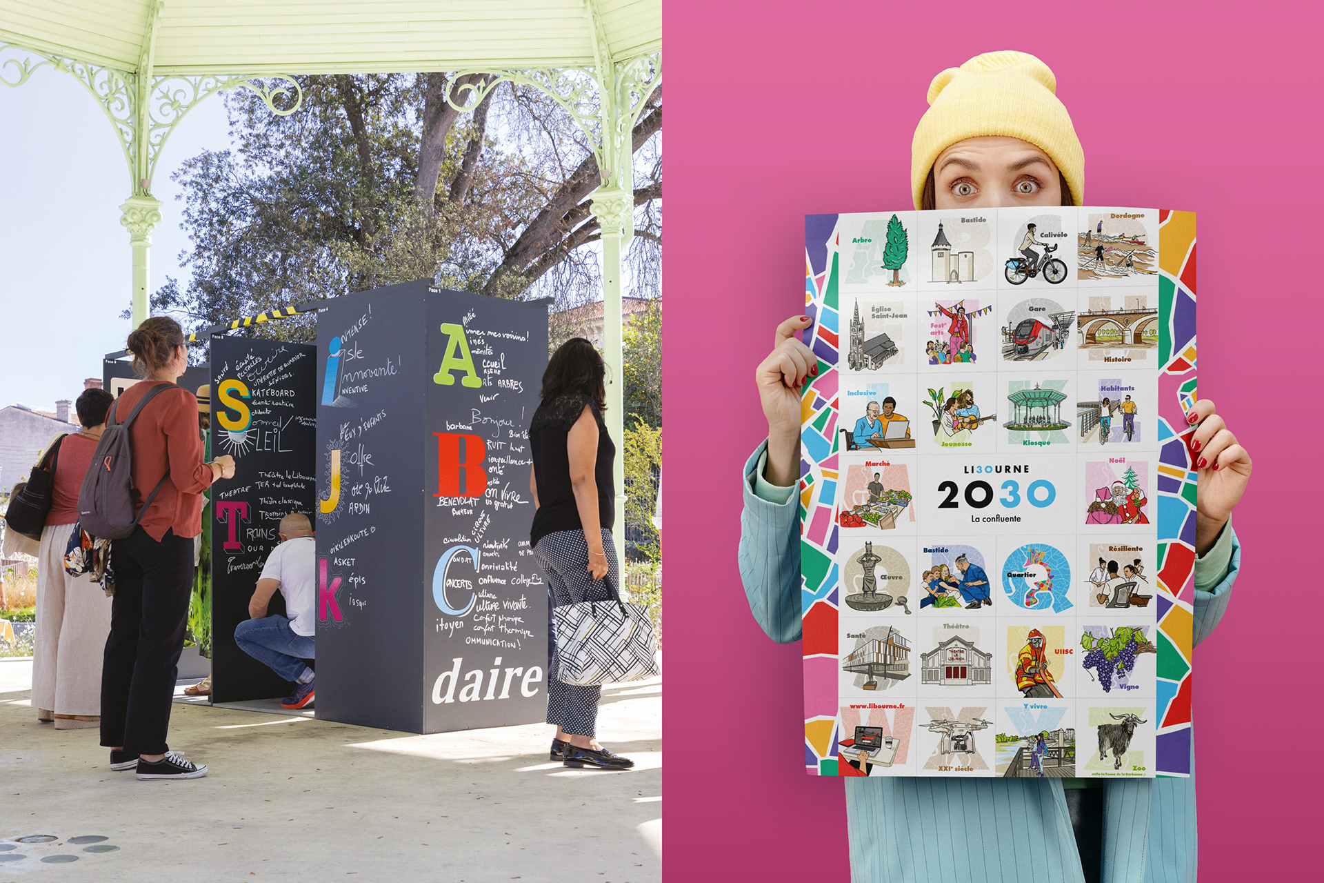 L’identité visuelle du projet urbain Libourne 2030 se base sur la cartographie de la ville pour faire apparaître une véritable mosaïque urbaine. Elle reflète les multiples projets qui maillent le territoire et démontre le dynamisme de la ville et de ses quartiers, sa diversité et ses identités.