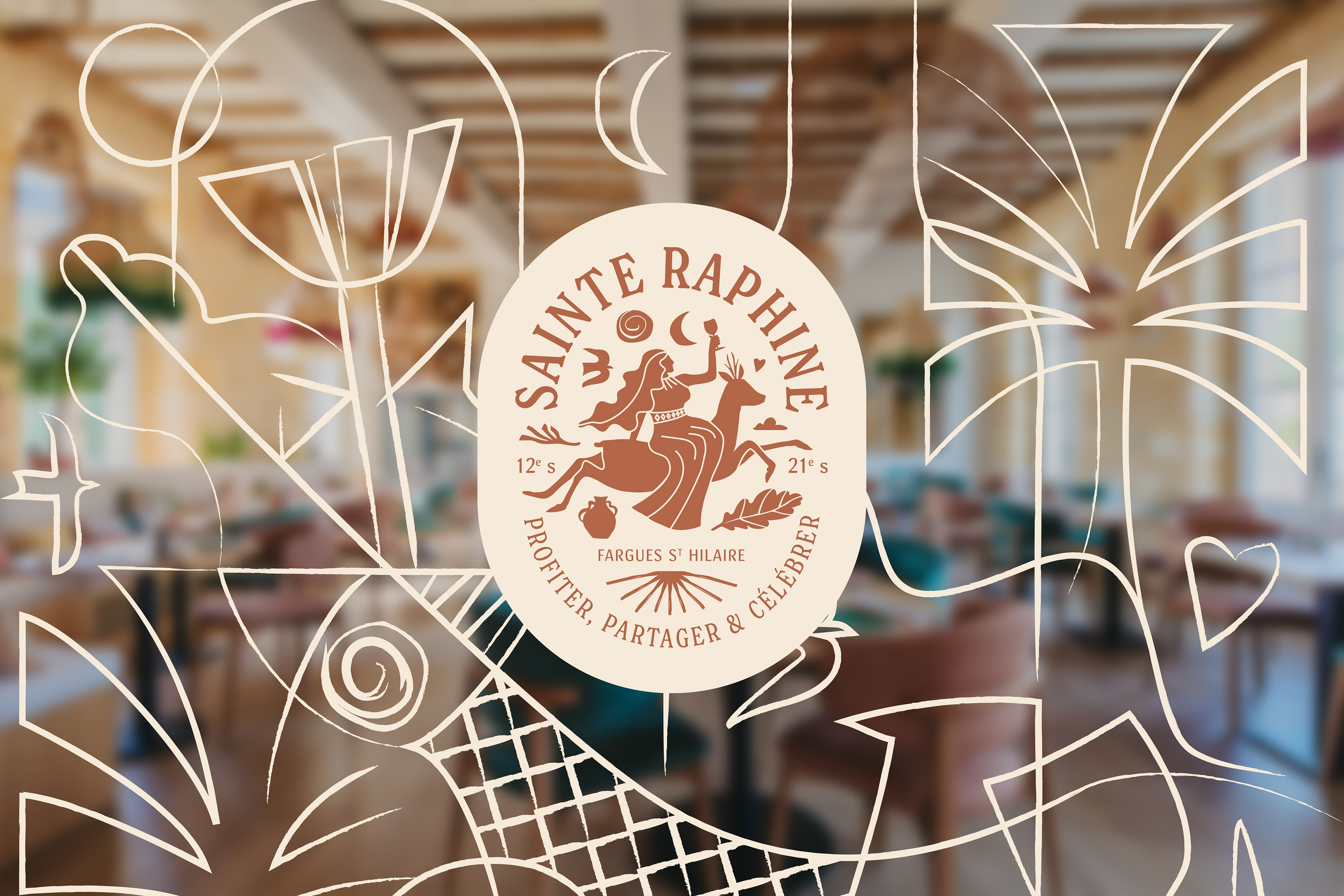 Un nouveau lieu de vie en pleine nature. Restaurant, bar, séminaire, mariage, hébergements, boutique. Le défi était de donner vie à ce lieu. Pour ce faire nous avons personnifié Sainte Raphine… Elle aime les plaisirs simples et la visite à l’improviste de ses amis.